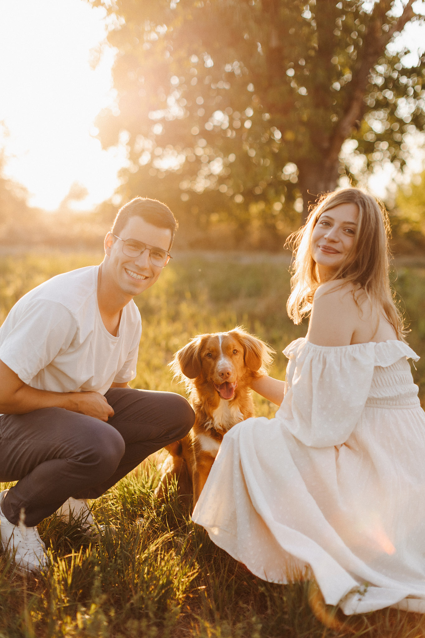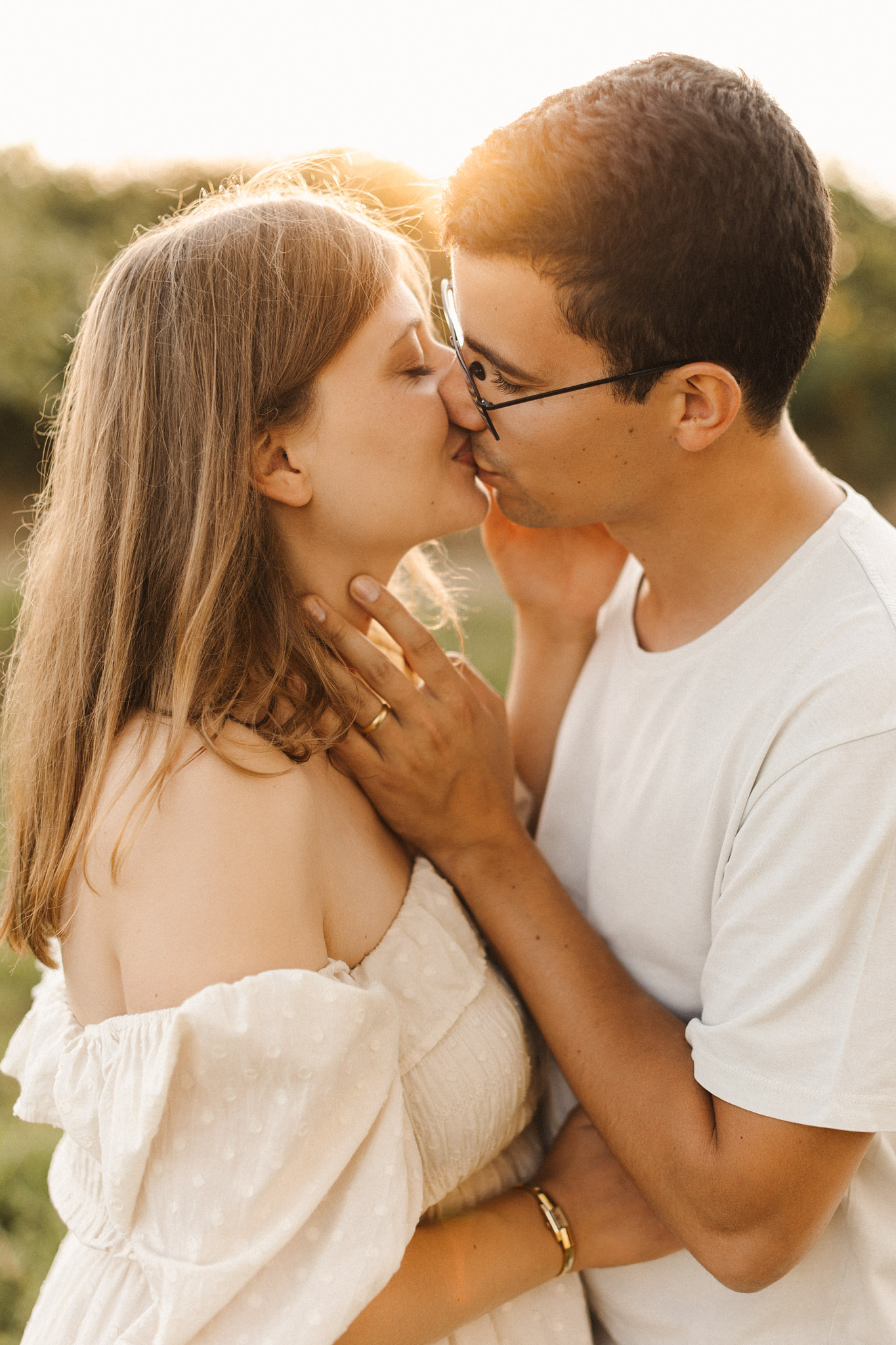 Ein lauer Sommerabend, goldenes Licht, ein verliebtes Paar, das bald Eltern wird – und mittendrin ein vierbeiniger Begleiter auf leisen Pfoten. Dieses Babybauchshooting in Stutensee-Spöck war für mich als Familienfotografin etwas ganz Besonderes. Die Verbindung zwischen den beiden (bald) Eltern, ihre Vorfreude und die Ruhe des Sonnenuntergangs – all das machte diesen Moment so magisch.